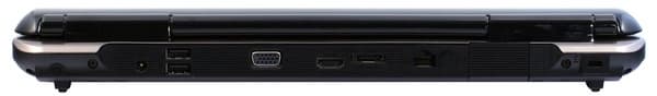 На задней грани ноутбука портов достаточно много, и это еще один признак домашнего мультимедийного ноутбука, который стоит на столе и переносится с места на место очень редко: подключать и отключать разъемы на задней стенке неудобно, в портативных моделях их стараются выносить на боковые грани.