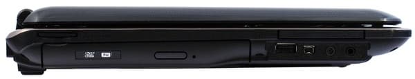 На левой грани расположен оптический привод. Левшам пользоваться удобно, правшам — нет (если до этого привык к ноутбуку, а почти у всех моделей привод расположен на правой стенке, то постоянно ищешь его не там). Дальше — порт USB, порт FireWire, аудиоразъемы. Над ними расположен слот ExpressСard, если в него вставлена большая карта, работать с разъемами под ним неудобно.