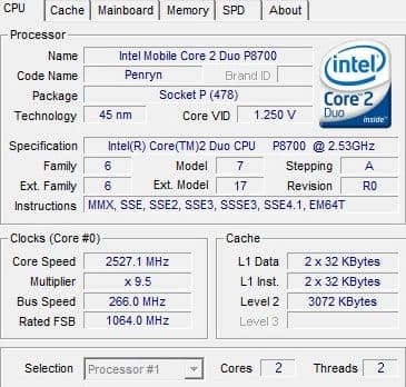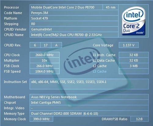 | Процессор | Intel Core 2 Duo T9400/P8600/P8400/P7350/ T6600/T6400/T5900/T5800 2,53 ГГц - 2 ГГц | Mobile DualCore Intel Core 2 Duo P8700, 2533 МГц (9,5 x 267) |