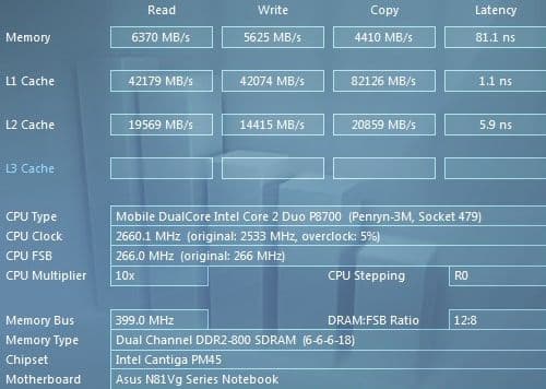 С помощью утилиты Everest было произведено краткое тестирование производительности подсистемы памяти ноутбука. Вот результат теста памяти для ASUS N81Vg.