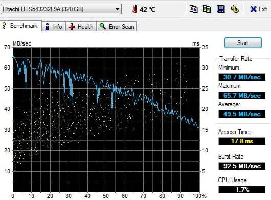Жесткий диск достаточно быстрый, особенно в начале чтения. Все остальные цифры также достаточно неплохие, за что ему досталась самая низкая оценка в системе — непонятно.