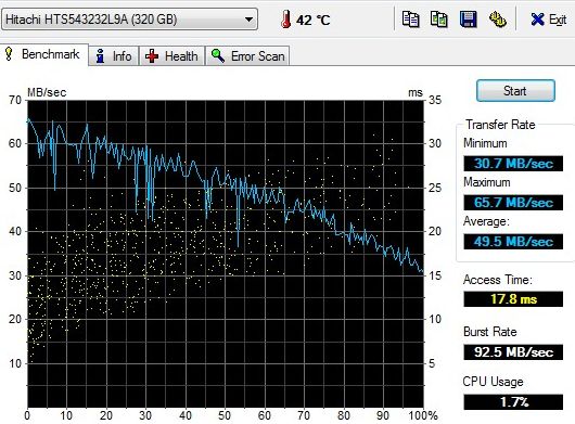 Температура жесткого диска уже великовата, 42 градуса. Большинство утилит контроля считают, что это уже ненормально высокая температура, она способна негативно сказаться на жизни жесткого диска. Впрочем, это температура после тяжелого теста, при стандартной работе жесткий диск холоднее.