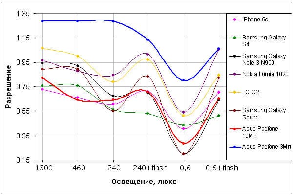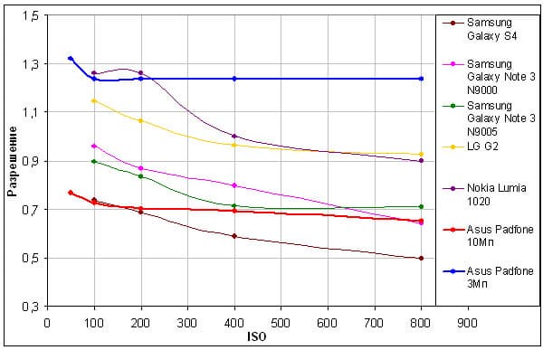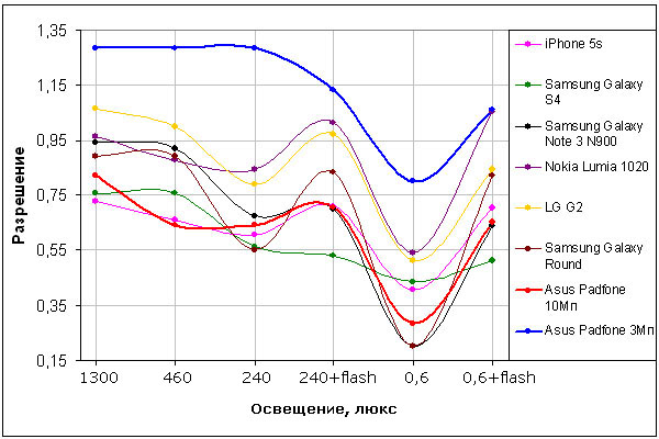 График зависимости разрешения от освещенности — это как раз тот редкий случай, когда цифры дают ложную информацию. При создании снимка 3 Мп камера делает упор именно на повышение четкости контрастных объектов, делает это очень хитро, так, что радиальная мира не может дать объективной информации. Визуально же видно, что четкость, если и повышается, то совсем незначительно. Если же снимать измерения по всей строгости эксперимента, то данная кривая на графике опустится и окажется немного выше кривой, соответствующей 10 Мп.