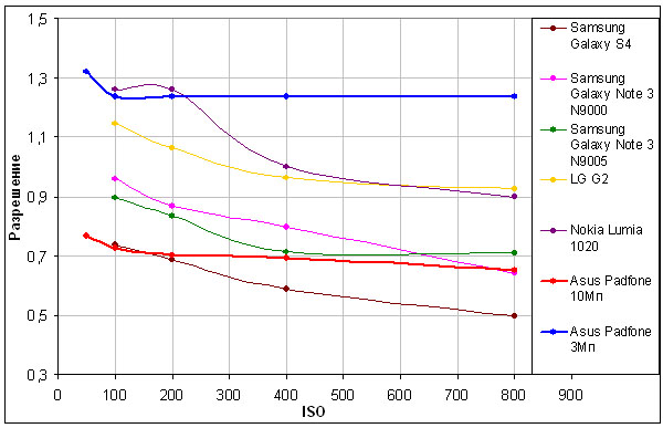 С зависимостью разрешения от светочувствительности камера, похоже, не хитрит, и в таком случае ее поведению могут позавидовать даже компакты.