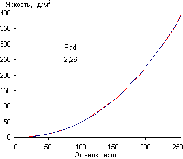 Контрастность (примерно в центре экрана) нормальная — порядка 770:1. Время отклика при переходе черный-белый-черный равно 20 мс (11 мс вкл. + 9 мс выкл.). Переход между полутонами серого 25% и 75% (по численному значению цвета) и обратно в сумме занимает 32 мс. Построенная по 32 точкам гамма-кривая не выявила завала ни в светах, ни в тенях, а показатель аппроксимирующей степенной функции равен 2,26, что незначительно выше стандартного значения в 2,2, при этом реальная гамма-кривая мало отклоняется от степенной зависимости: