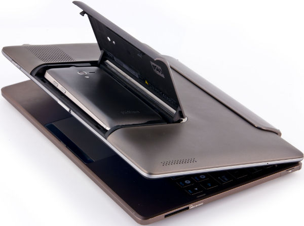 В собранном закрытом виде PadFone напоминает нетбук и, одновременно, самый первый Eee Pad Transformer. Главное отличие — это задняя стенка планшетного модуля, на которой мы видим выпирающую крышечку. Под ней — смартфон. Он вставляется внутрь планшетного модуля и закрывается сверху этой крышкой (как у ларца).