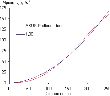 Построенная по 32 точкам гамма-кривая не выявила существенного завала ни в светах, ни в тенях, а показатель аппроксимирующей степенной функции равен 1,88, что отличается от стандартного значения в 2,2: