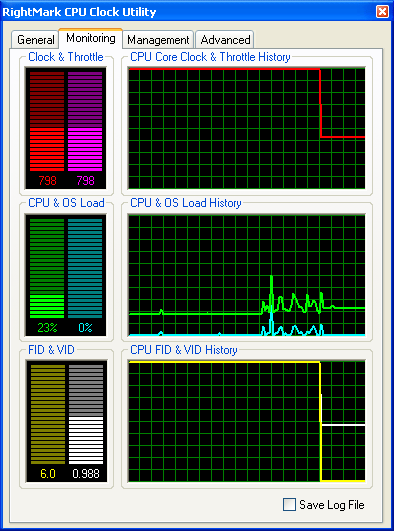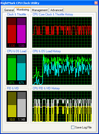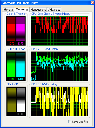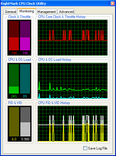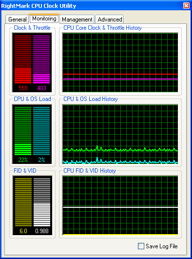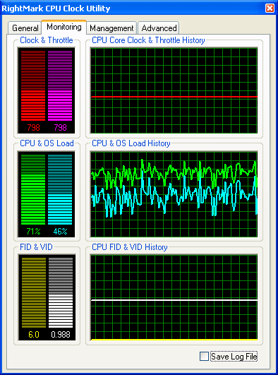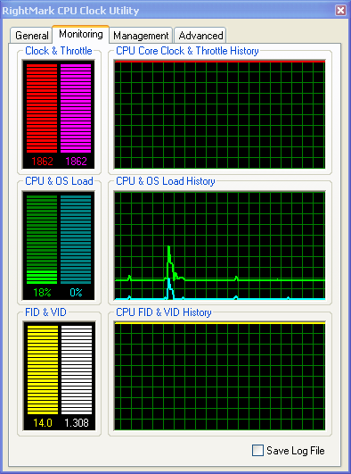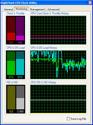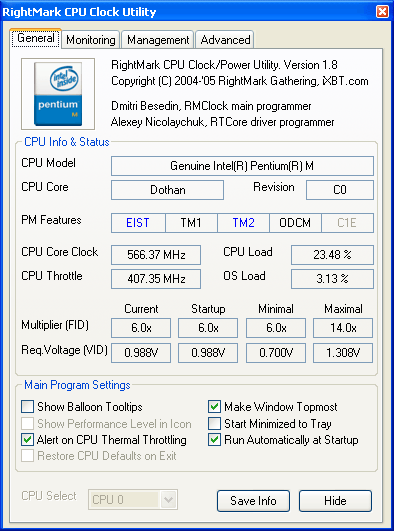 На этом, пожалуй, стоит закончить с рассмотрением пользовательского интерфейса и функциональных возможностей программы и перейти к более детальному изучению поведения всех восьми профилей энергопотребления системы, реализованных в утилите. Для этого мы воспользуемся нашей разработкой — утилитой RightMark CPU Clock Utility 1.8, предназначенной, в общем-то, для той же самой цели — управления производительностью и энергопотреблением процессора (в том числе, Intel Pentium M). Тем не менее, сейчас мы воспользуемся лишь предоставляемыми ею возможностями мониторинга частоты и загрузки процессора, а также коэффициента умножения частоты системной шины (FID) и запрашиваемого уровня питающего напряжения процессора (VID).