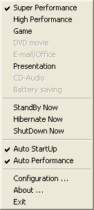 Во-первых, в нем можно выбрать любой из доступных профилей производительности системы (на представленном скриншоте можно выбрать только 4 профиля, так как питание ноутбука осуществляется от сети, остальные 4 профиля относятся к режиму работы от батареи). Во-вторых, можно немедленно отправить систему в спящий режим (Standby, Hibernate), или вовсе ее выключить (Shutdown). Впрочем, все то же самое еще проще сделать стандартными средствами Windows :).