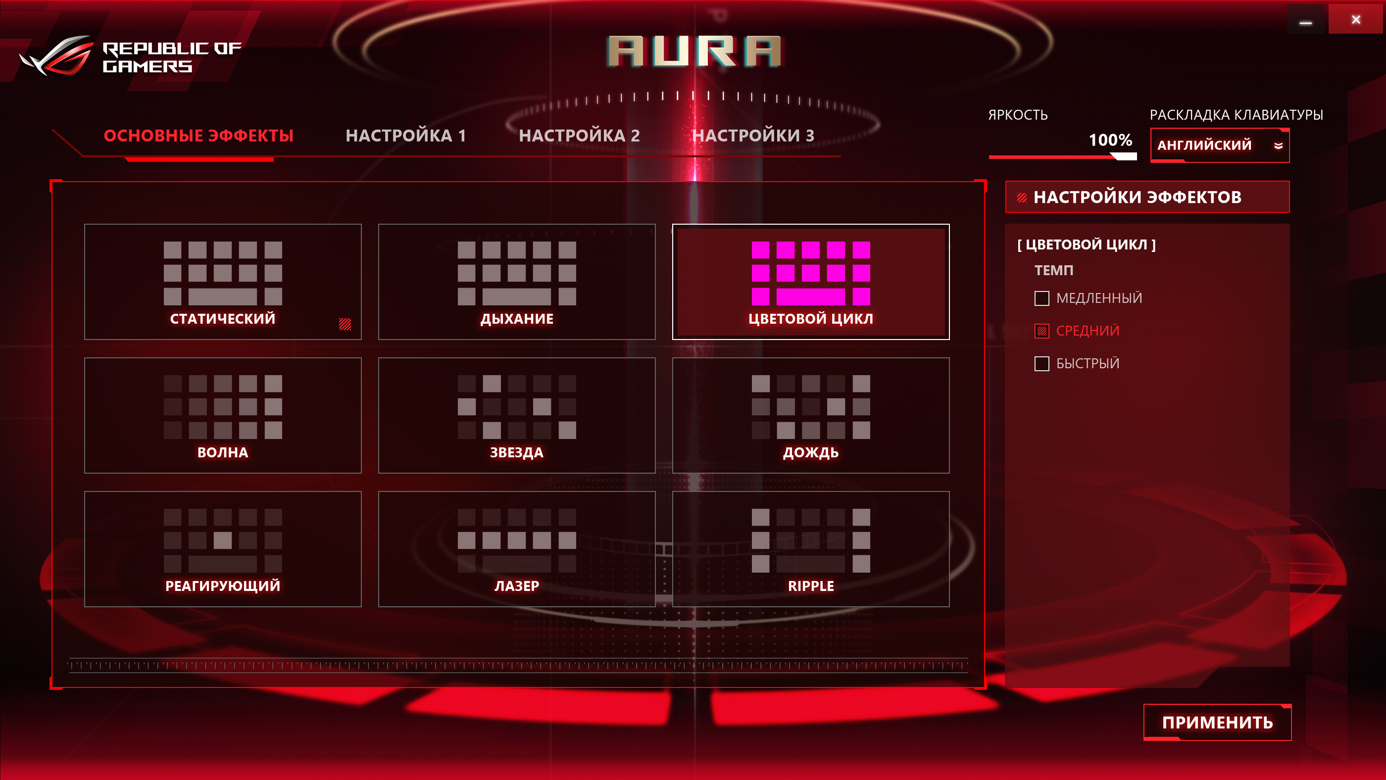 Как уже отмечалось, клавиатура в ноутбуке имеет настраиваемую RGB-подсветку. С использованием утилиты Asus Gaming Center можно настраивать цвет каждой клавиши и задавать цветовые эффекты (дыхание и т. д.). Настройки подсветки можно сохранять в профиле. Всего можно создавать до трех собственных профилей подсветки.