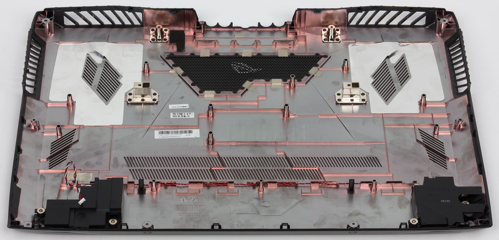 Нижняя панель корпуса сделана из пластика серебристого цвета, стилизованного под шлифованный металл. На нижней панели расположены вентиляционные сетки, а также имеется полупрозрачная вставка из черного оргстекла (исключительно моддинговый элемент). Для устойчивого положения ноутбука на горизонтальной поверхности на нижней панели есть четыре прорезиненные ножки.