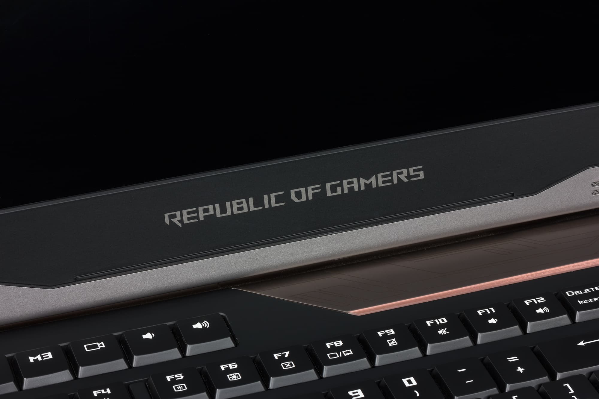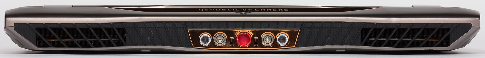 На рамке сверху экрана по центру расположена веб-камера и миниатюрные отверстия двух микрофонов. Снизу — надпись Republic Of Gamers.