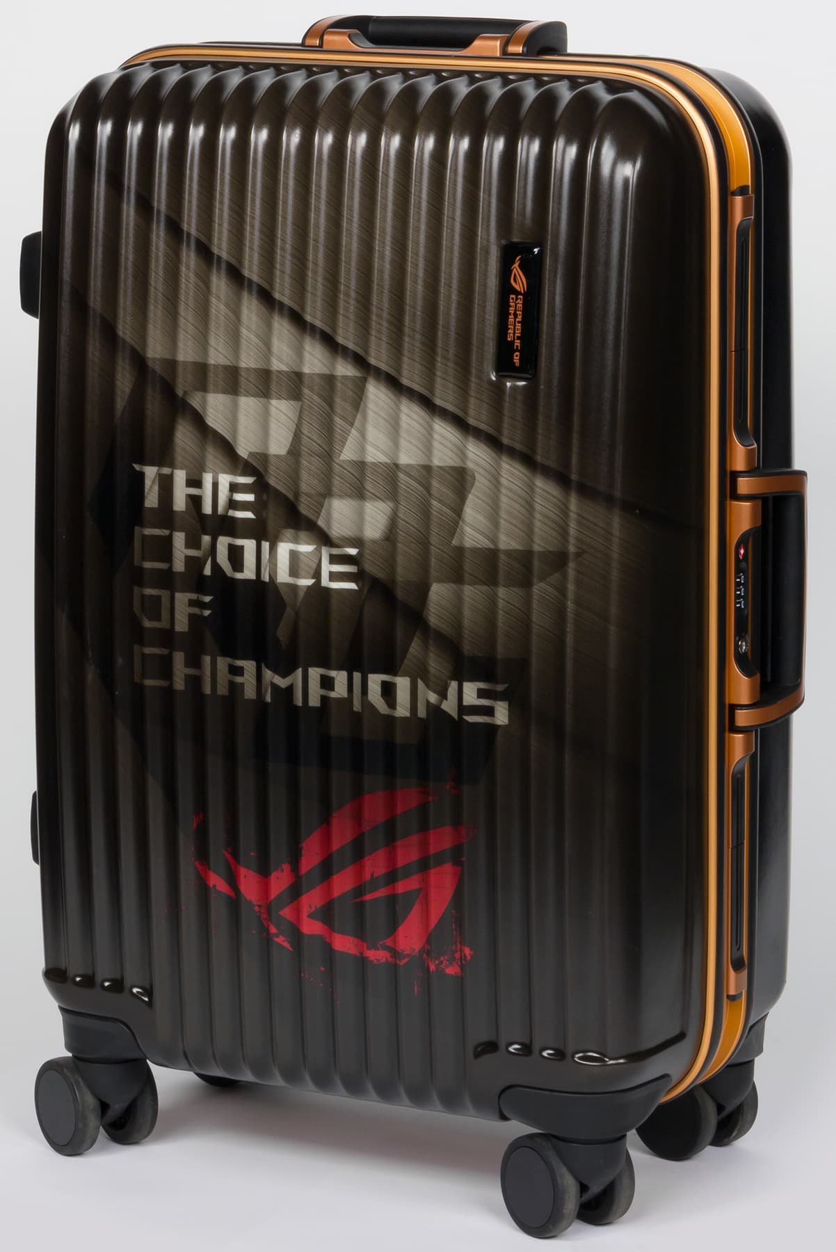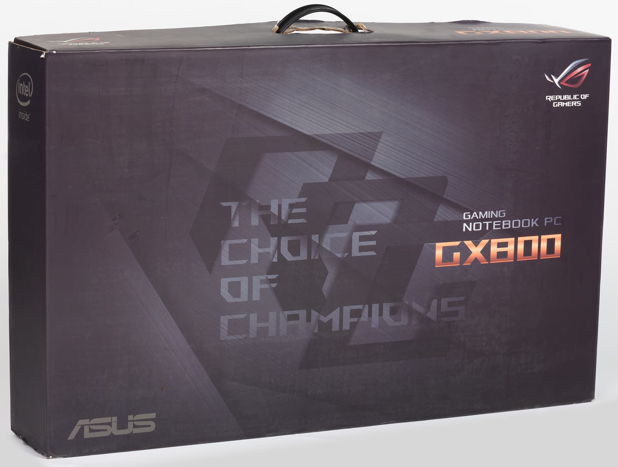 Ноутбук Asus ROG GX800VHK, как и его предшественник Asus ROG GX700VO, поставляется в комплекте с пластиковым чемоданом на четырех колесиках, с выдвижной ручкой и кодовым замком. На чемодане имеется принт с логотипом Asus ROG и надписью «The choice of champions» («Выбор чемпионов»).