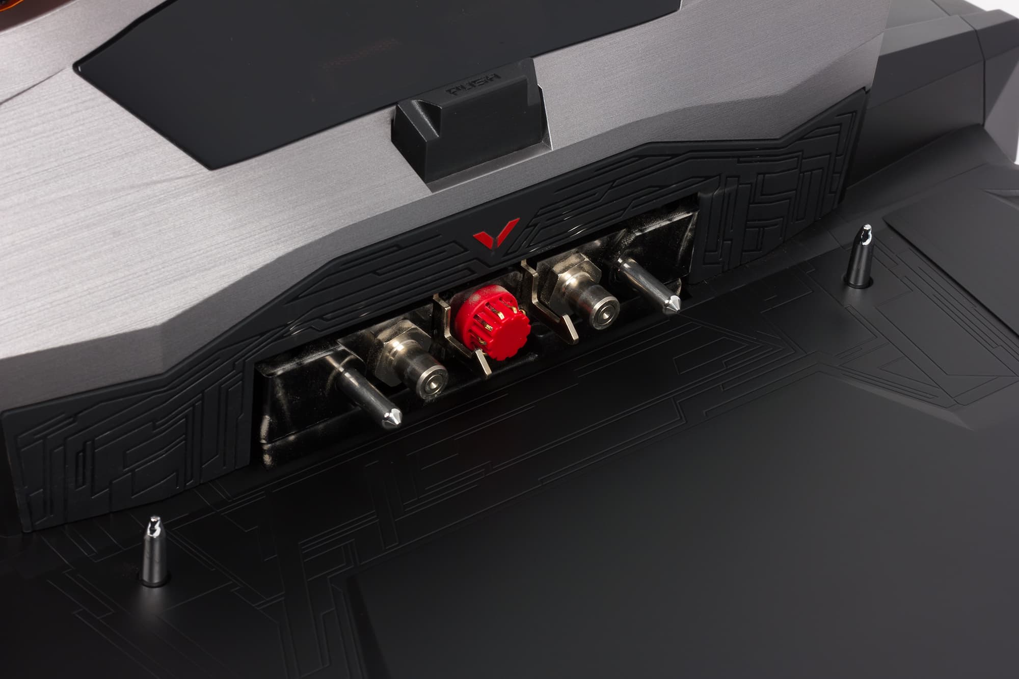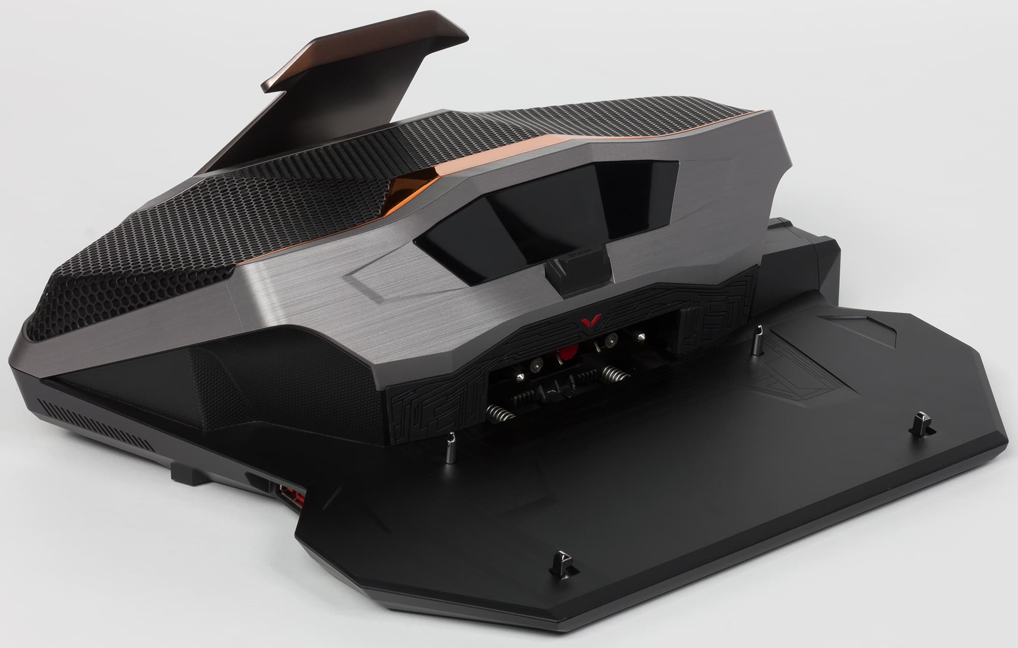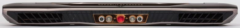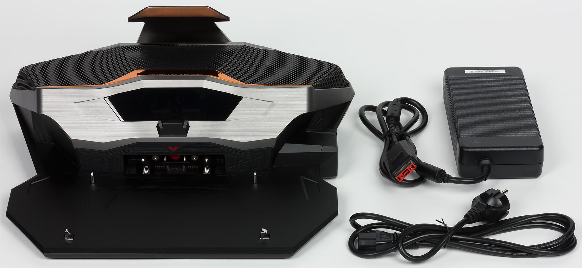 На заднем торце корпуса расположены вентиляционные решетки для выдува горячего воздуха (по бокам), а также коннектор для подключения док-станции. Этот коннектор включает два патрубка для подключения жидкостной системы охлаждения.