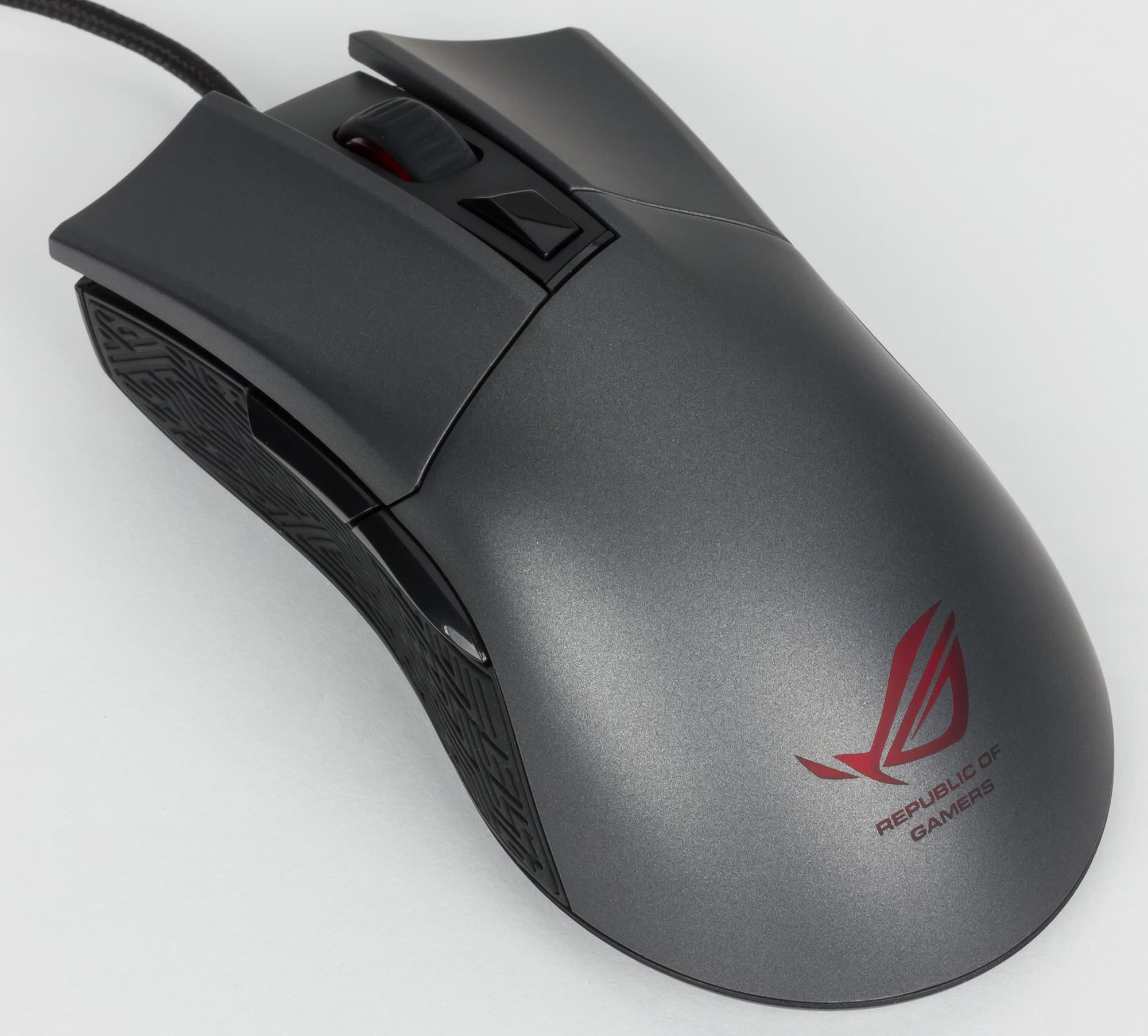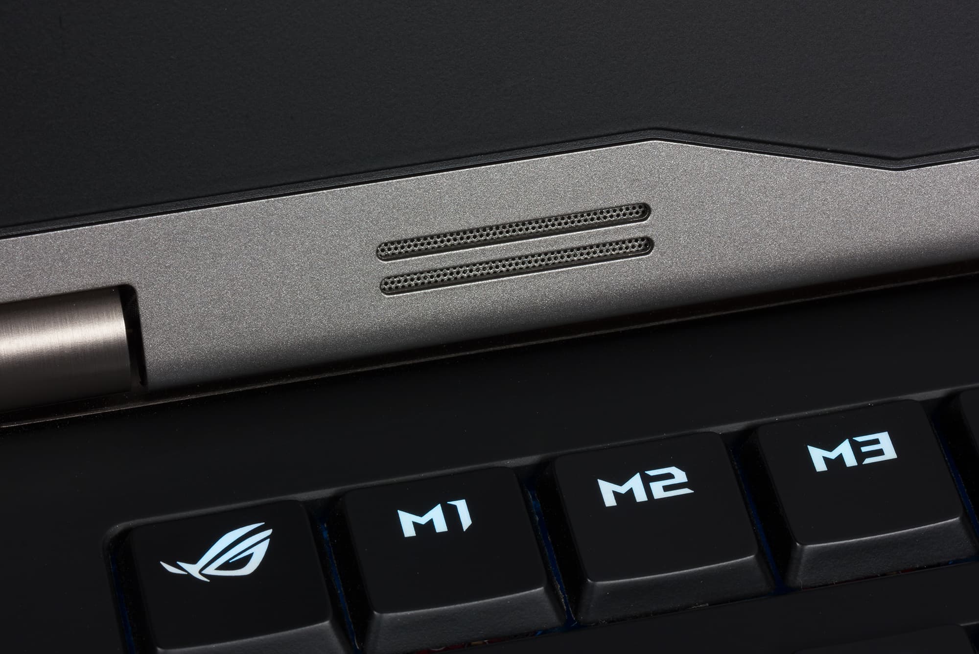 В левом углу рабочей поверхности имеется панель из семи отдельных клавиш. Две клавиши регулируют громкость звука, еще одна предназначена для захвата видео с экрана с использованием функции ShadowPlay, есть клавиша для запуска приложения Asus Gaming Center, а еще три предназначены для выполнения макросов.