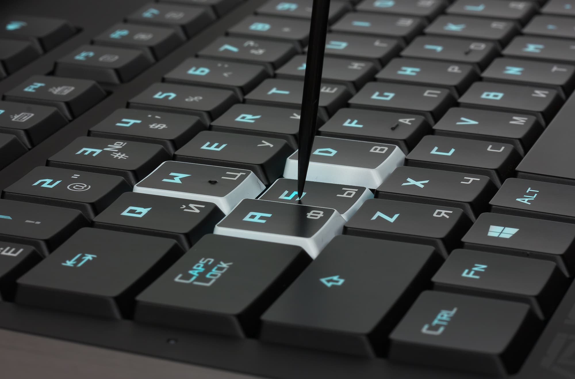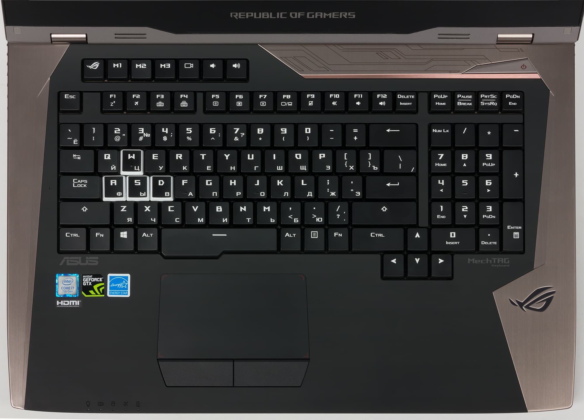 Клавиатура в ноутбуке оптимизирована под нужды геймеров. Клавиши W, A, S, D, которые наиболее часто используются в играх, немного отличаются от всех остальных. Это отличие заключается в том, что у всех клавиш боковые поверхности (окантовка) имеют черный цвет, а у игровых клавиш W, A, S, D боковые поверхности белого (полупрозрачного) цвета.