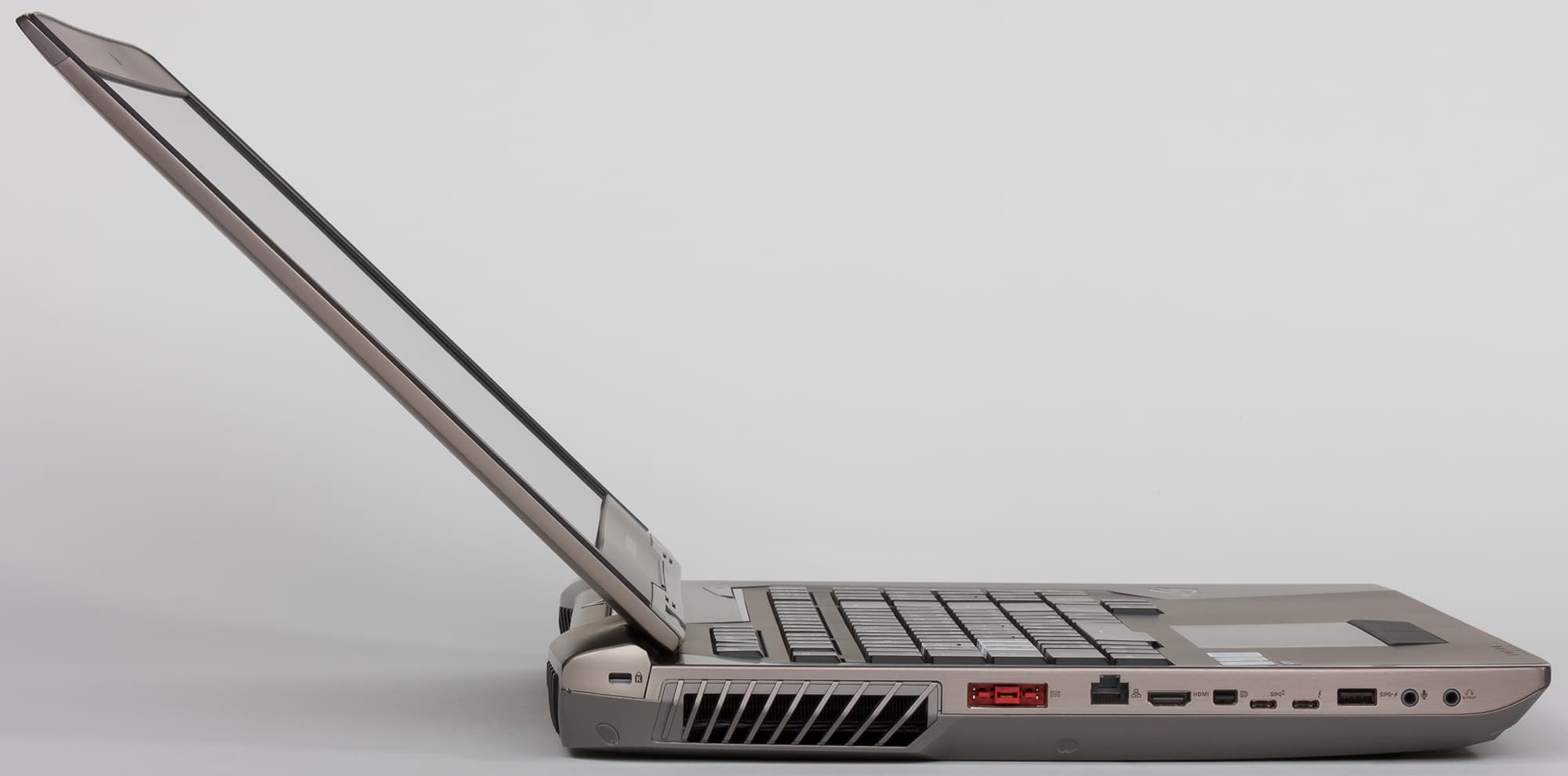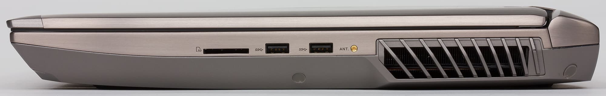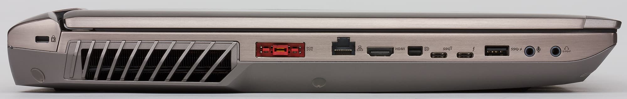 На левом торце корпуса ноутбука расположены: порт USB 3.0, два аудиоразъема типа миниджек, разъем RJ-45, порт USB 3.1 (Type C), порт Thunderbolt (Type C), видеовыходы HDMI и Mini-DisplayPort, а также отверстие для кенсингтонского замка, разъем питания прямоугольного типа и сетка радиатора для выдува горячего воздуха.
