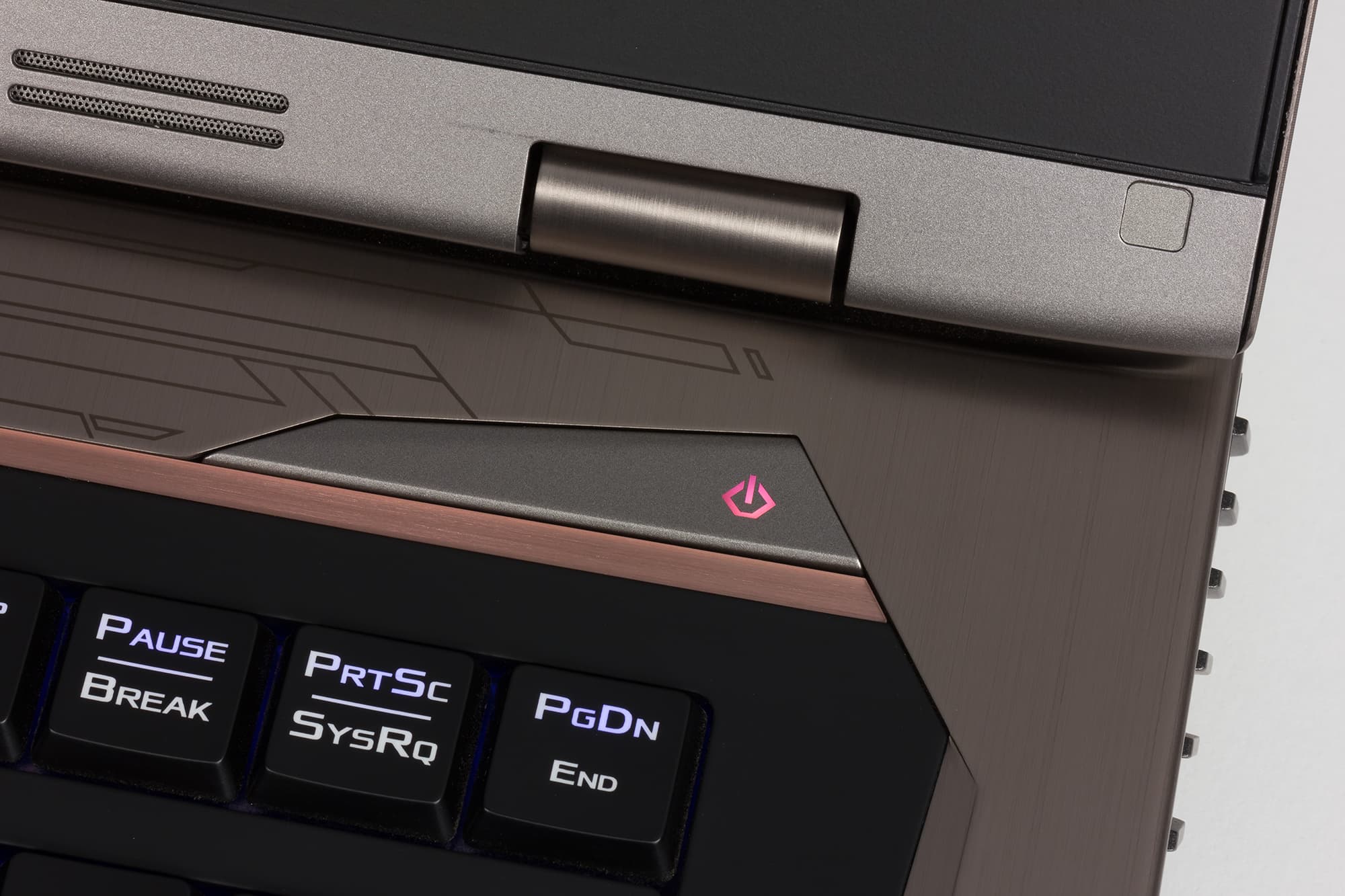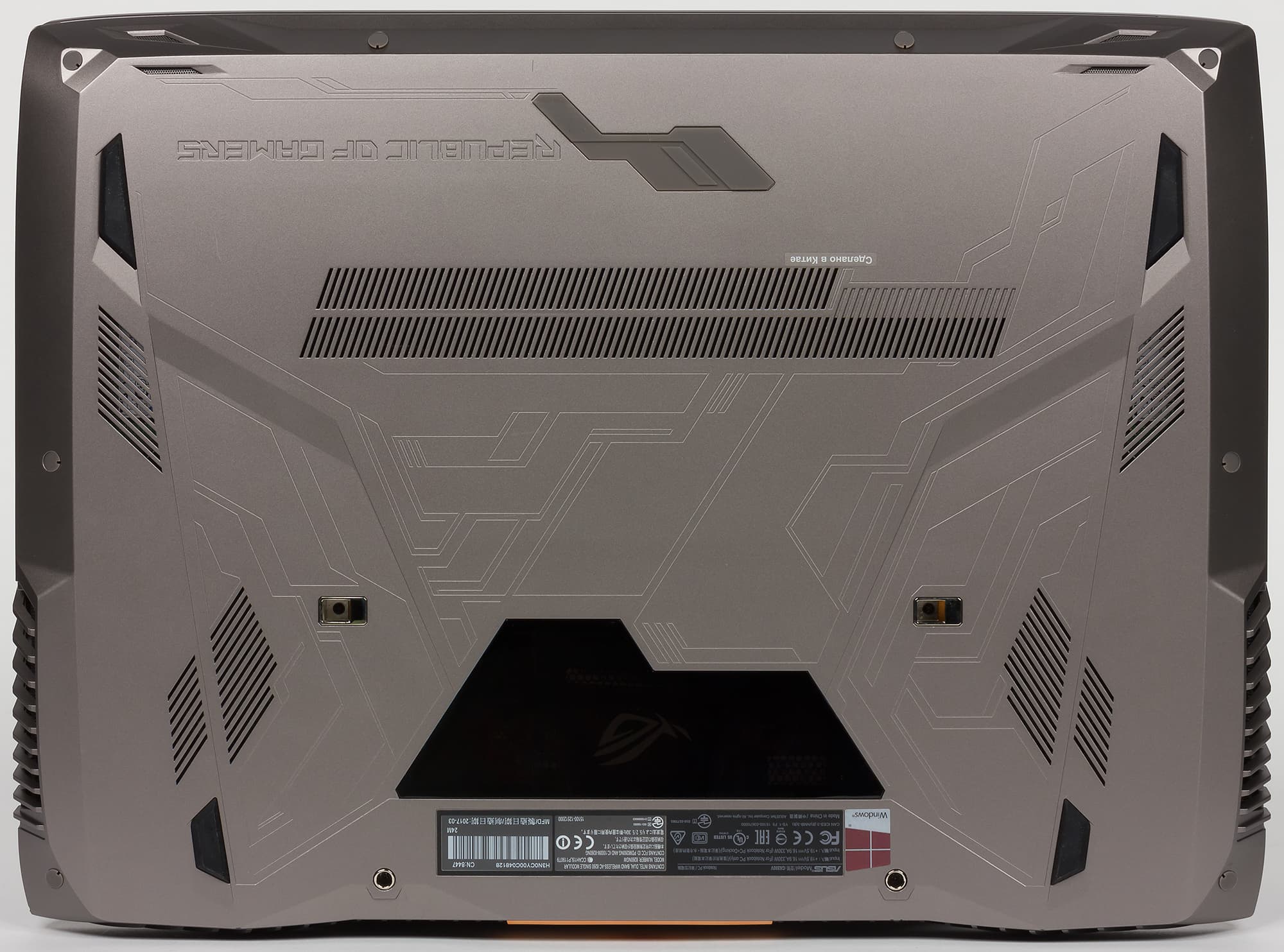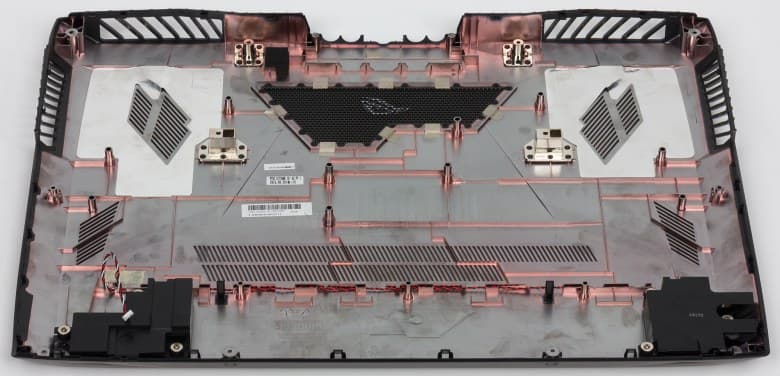 Корпус ноутбука выполнен из пластика и металла. Крышка сделана из шлифованного алюминия серебристого, немного с бронзовым отливом, цвета. На крышке красуется зеркальный подсвечиваемый логотип Asus ROG и две подсвечиваемые моддинговые вставки медно-оранжевого цвета.