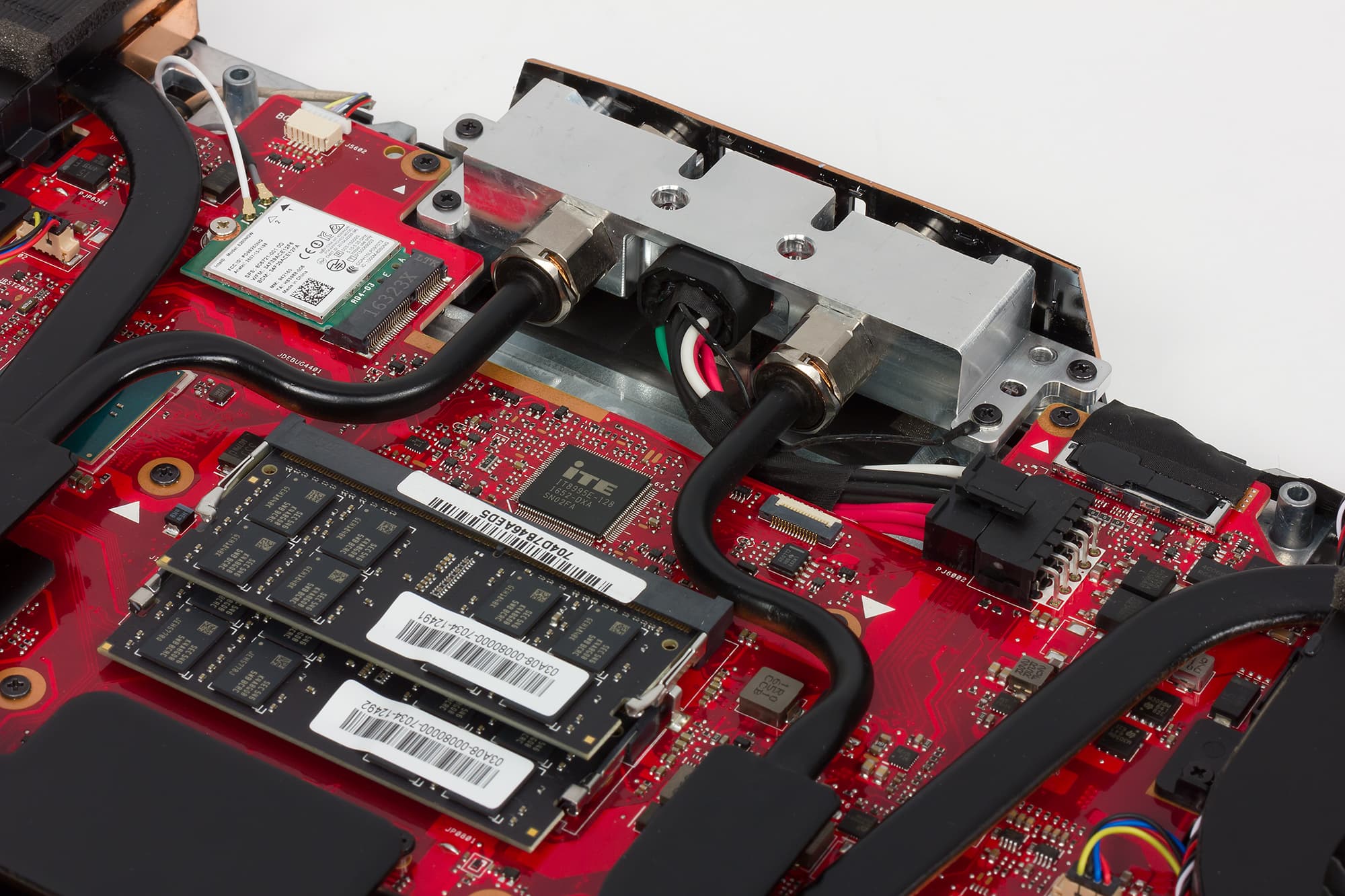 После этого можно получить доступ к аккумуляторной батарее, двум из трех SSD-накопителей, двум из четырех модулей памяти, модулю Wi-Fi и системе охлаждения. Отметим, что системная плата в ноутбуке двухсторонняя, так что еще один накопитель и два слота для установки модулей памяти расположены с обратной стороны. Но чтобы получить доступ к обратной стороне, нужно снимать клавиатурный блок, а это сделать уже непросто.