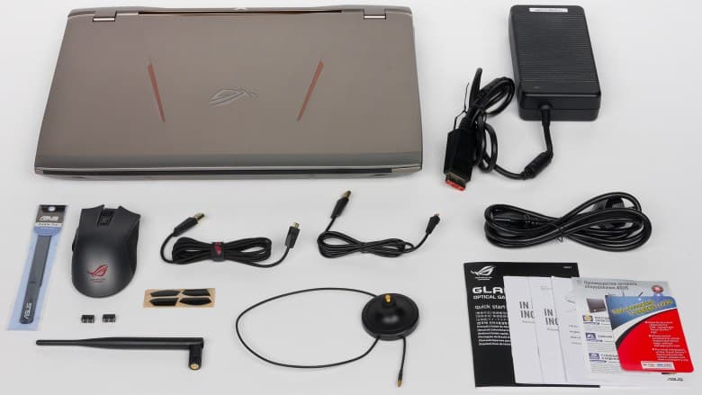 Кроме чемодана и жидкостной системы охлаждения с адаптером питания, в комплект поставки ноутбука входит еще один адаптер питания мощностью 330 Вт (уже для самого ноутбука), игровая мышка серии Asus ROG, подключаемая выносная антенна для Wi-Fi-модуля, краткое руководство пользователя и гарантийный талон.