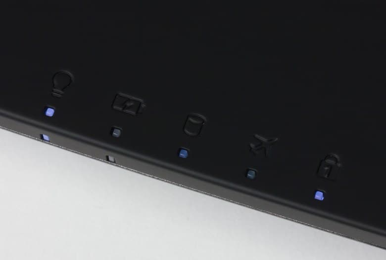 Светодиодные индикаторы состояния ноутбука расположены на переднем торце слева от тачпада. Всего таких индикаторов пять.