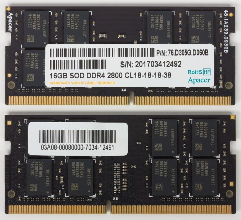 Для установки модулей памяти в ноутбуке Asus ROG GX800VHK предназначено четыре слота, а максимальный объем памяти, который можно установить, составляет 64 ГБ. В нашем случае в ноутбуке было установлено четыре одинаковых модуля памяти Apacer DDR4-2800 емкостью по 16 ГБ каждый (суммарный объем 64 ГБ). Частота памяти 2800 МГц реализуется через XMP-профиль, который может быть активирован при разгоне системы.