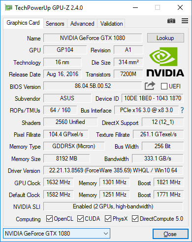 | Видеоподсистема | 2 × Nvidia GeForce GTX 1080 в режиме SLI (2 × 8 ГБ GDDR5) | |