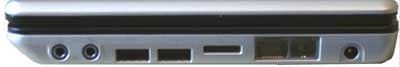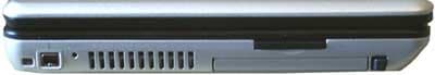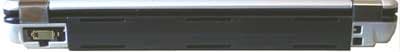 В отличие от «обычных» ноутбуков, на заднем торце разъемов практически нет — вся поверхность служит для крепления дополнительного аккумулятора. Соответственно и разъем один — для его подключения. Контакты прикрыты металлической пластинкой, которая, вне всякого сомнения, потеряется после первого же подключения аккумулятора.
