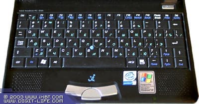 При этом клавиатура почти как у «больших» ноутбуков, только клавиши PgUp, PgDn, Home и End нажимаются с дополнительной Fn. Пользоваться клавиатурой достаточно удобно — набор текста во время поездки в метро особых неудобств не доставлял. Правда, для работы на коленях ноутбук, на мой взгляд, слишком мал — приходится постоянно придерживать его обеими запястьями. Так что лучше работать, подложив дипломат. Устройство позиционирования мне лично нравится больше, чем тачпэд — я уже говорил, что, по-моему, оно больше подходит для работы с текстами, а тачпэд — с графикой. Дополнительная третья кнопка служит для скроллинга.