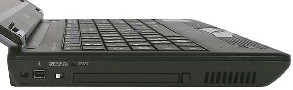Если взглянуть на левую боковину видно, что конструкция ноутбука все-таки поменялась существенно. "Жертвой" стал картовод — теперь он внешний, и, как и комбо-драйв, должен приобретаться отдельно. Зато добавился аппаратный выключатель беспроводной сети. Вещь на самом деле полезная — отключил при отсутствии надобности и не думаешь, в каком режиме энергопотребления у тебя этот адаптер работает. Можно, конечно, то же самое сделать и программным способом, но для "обычного" пользователя выключатель гораздо удобнее. В результате получаем (слева направо)