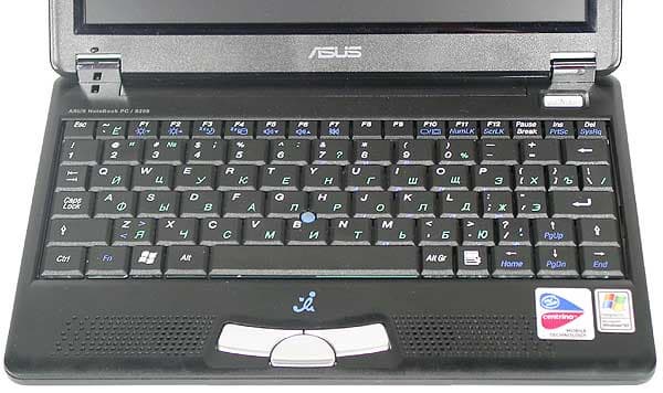 Клавиатура представляет собой достаточно удачную попытку обеспечить максимум функциональности при недостатке места. Получилось почти "как у больших". Пострадали только клавиши PgUp, PgDn, Home и End — они нажимаются с дополнительной Fn. Набирать текст можно без особых проблем, хотя размер, конечно, сказывается — руки устают заметно быстрее, да и с печатью слепым способом могут быть проблемы. Устройство позиционирования курсора мне лично очень понравилось. Правда, я являюсь давним поклонником Track Point. Третья кнопка служит для скроллинга. При работе в дороге желательно распологать ноутбук на какой-нибудь плоской поверхности (например, на чемодане-дипломате), иначе приходится постоянно придерживать его обеими запястьями. Если суммировать впечатления от работы, то при написании коротких текстов и просмотре интернет-контента неудобств нет.