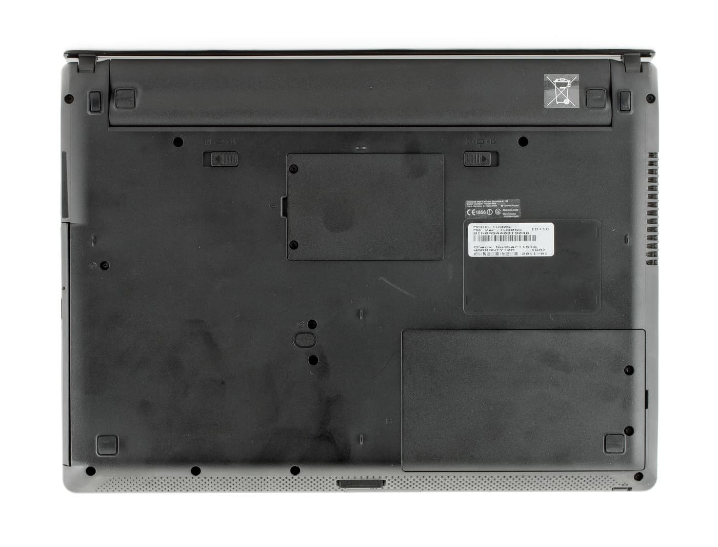 На дне у U30s два лючка, один служит для доступа к слоту памяти, второй — к жесткому диску. Обратите внимание, что на дне нет вентиляционных отверстий, воздух засасывается не снизу. Поэтому с ноутбуком вполне можно работать, положив его на мягкую поверхность — он не будет греться и засасывать внутрь пыль. Это большой плюс конструкции корпуса, и характерен, скорее, для рабочего ноутбука.