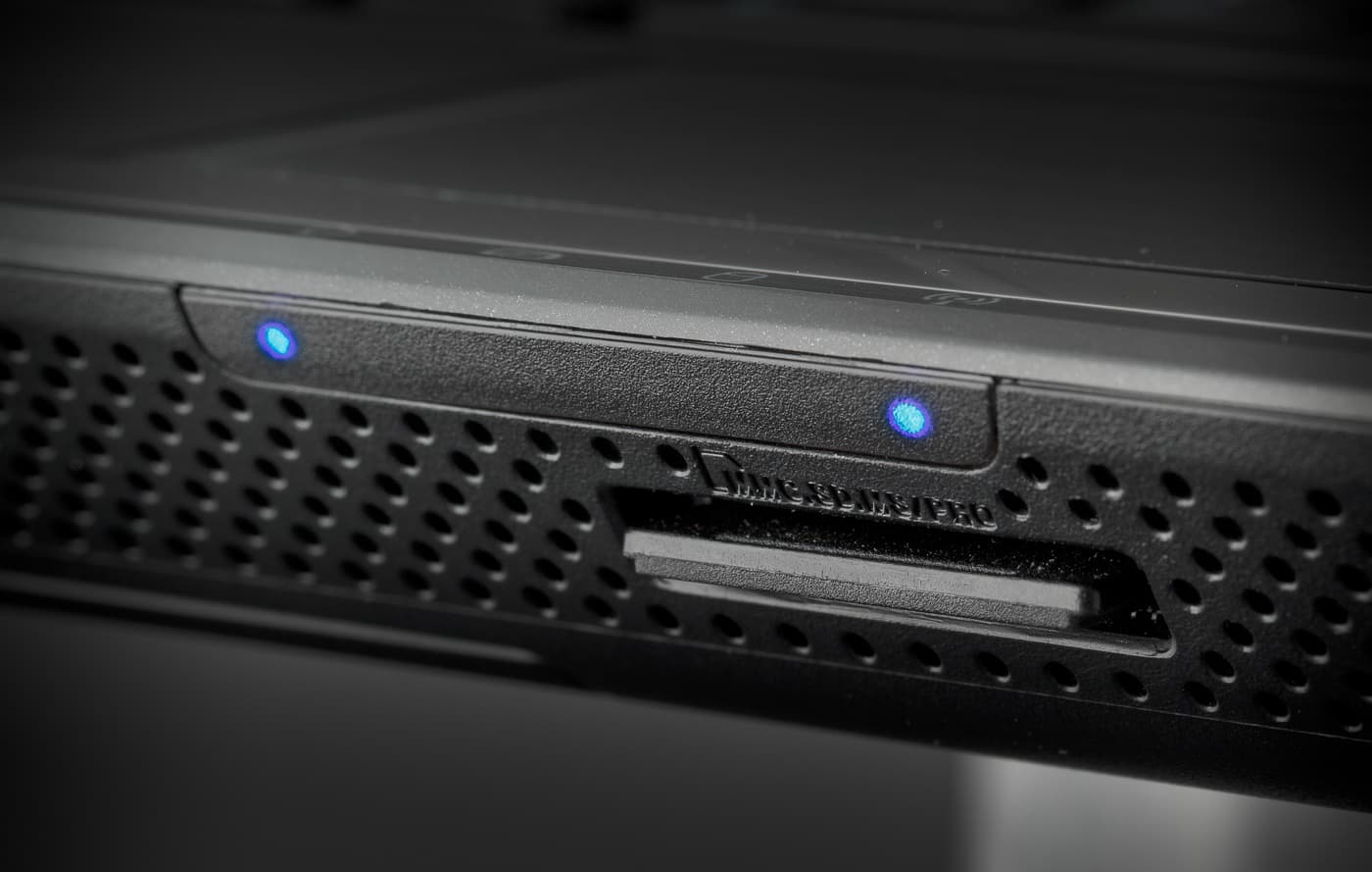 Большую часть правой грани занимает оптический привод, дальше идет один порт USB, разъем проводной сети и разъем для штекера питания. Штекер угловой, провод легко увести за матрицу и он не будет мешать на столе. Правшам подключать и отключать питание очень удобно.