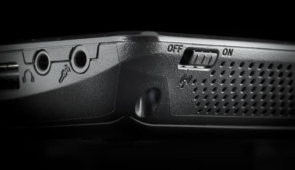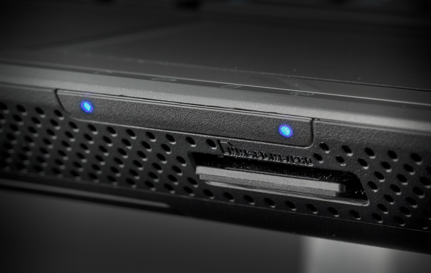 На передней грани расположен картовод, причем даже заглушка карточки из него неаккуратно торчит. Вся передняя панель в больших дырках, выглядит это не очень красиво. В этой решетке расположены динамики, которые играют «от стола». Такое расположение позволяет чуть улучшить средние частоты, когда ноутбук стоит на столе, зато сильно гасит звук, если поставить его на мягкую поверхность. В левом верхнем углу передней панели расположен аппаратный включатель беспроводных интерфейсов связи.