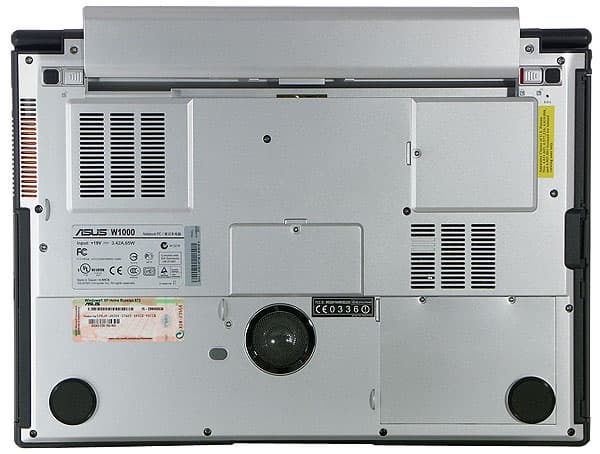 На нижней крышке — низкочастотный динамик, лючки отсеков памяти, жесткого диска и плат mini-PCI, а также заборные решетки системы вентиляции. Обращают на себя внимание мощные резиновые ножки в передней части корпуса.