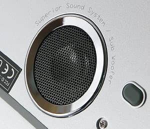 Традиционная защелка крышки отсутствует — в закрытом состоянии крышка удерживается при помощи магнитов. На переднем торце расположены динамики, блок разъемов (AV-in, выход на наушники/SPDIF, микрофонный вход, линейный вход/выход 3D Sound) и окошки инфракрасных портов. Желание собрать все аудиоразъемы в одном месте понятно, но все-таки расположение S/PDIF выхода на переднем торце представляется неоптимальным.
