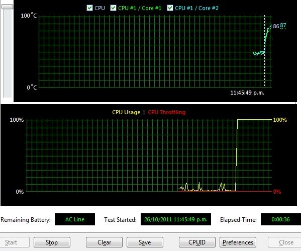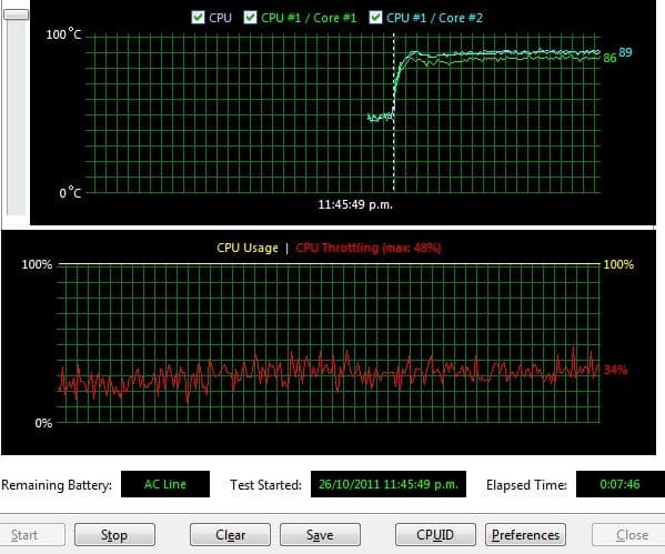 Что, кстати говоря, не так уж и просто. Отображаемая температура что процессора, что ядер оставалась на вполне пристойном уровне. Действительно, именно на этой температуре (особенно в случаях с горячими Core i7 M) Intel Turbo Boost начинает постепенно снижать уровень разгона процессора, чтобы добиться стабильных температурных показателей. В то же время, это не тот уровень, на котором должен начинаться троттлинг процессора, да еще в таких объемах.