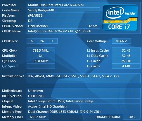| Процессор | Mobile DualCore Intel Core i7-2677M, 2600 МГц (26×100) | |