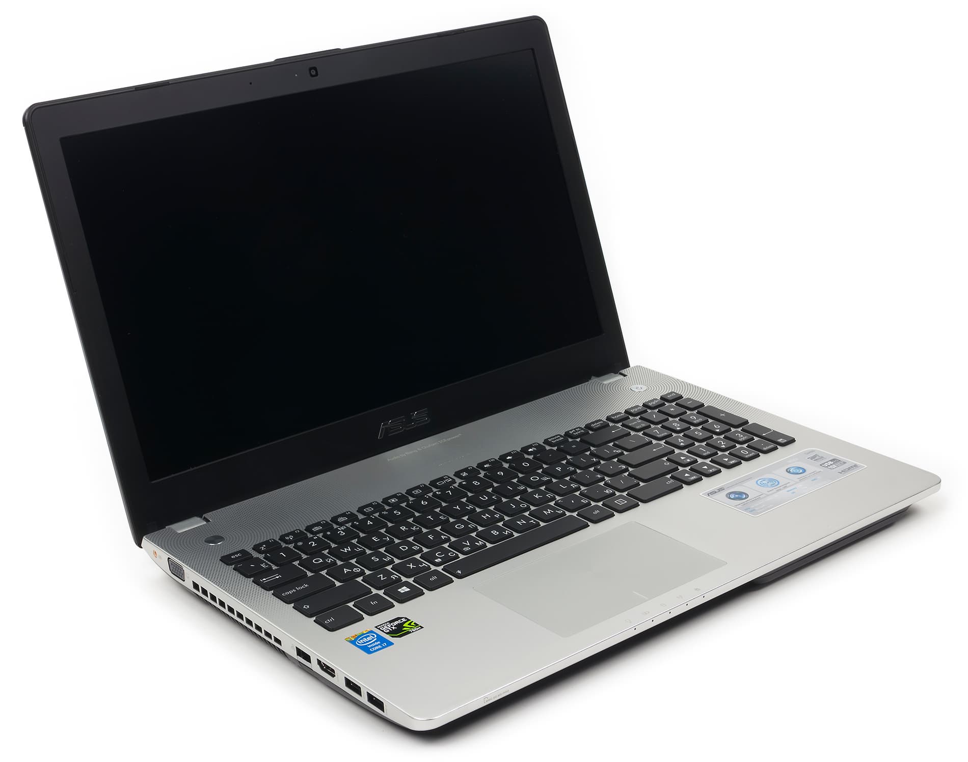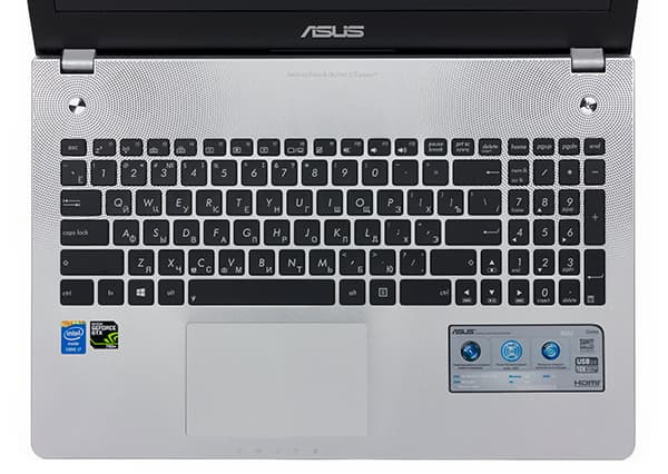 Поверхность, обрамляющая клавиатуру и тачпад, металлическая и имеет серебристый матовый цвет. А вот клавиши на клавиатуре черные. В этом, кстати, отличие серии Asus Nx6 (N46, N46, N76) от серии Nx50 (N550, N750), в которых клавиши имеют серебристый цвет (точно такой же, как и рабочая поверхность ноутбука). Какой цвет лучше — черный или серебристый, — вопрос субъективный. Это кому как больше нравится. Рамка вокруг экрана сделана из черного матового пластика. На рамке сверху экрана по центру расположена веб-камера, а снизу экрана — блестящий логотип Asus.
