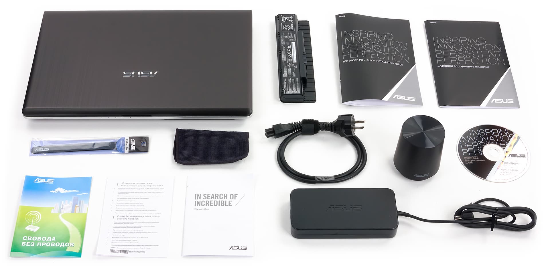 Также имеется краткое руководство пользователя, гарантийный талон, салфетка для протирки дисплея и даже липучка для скручивания проводов. Собственно, комплект поставки типичный для ноутбуков N-серии.