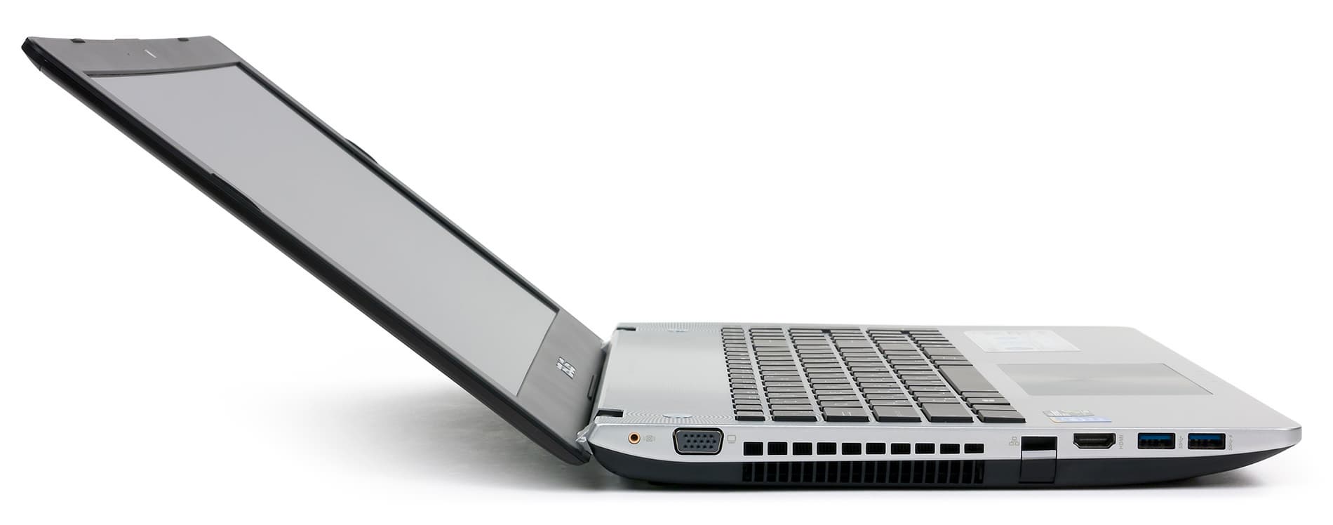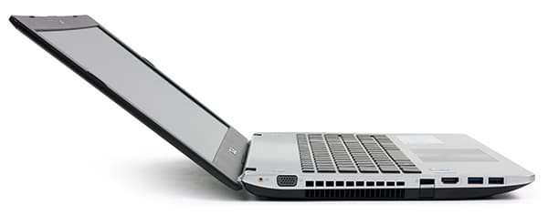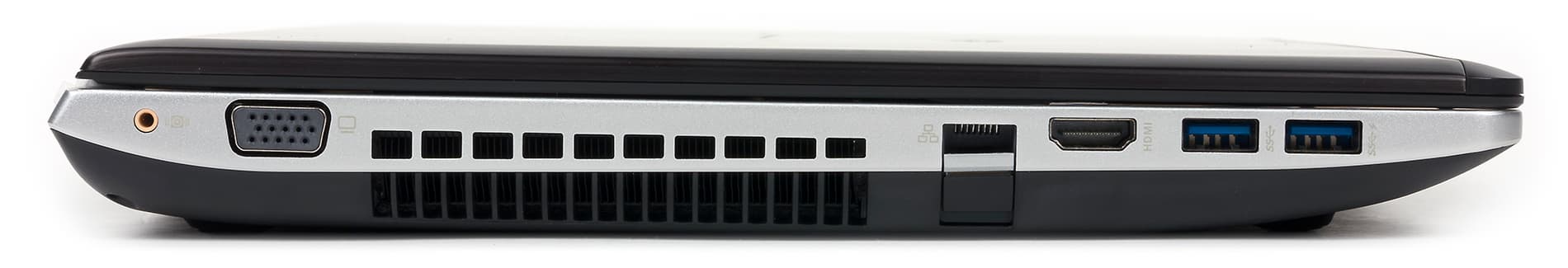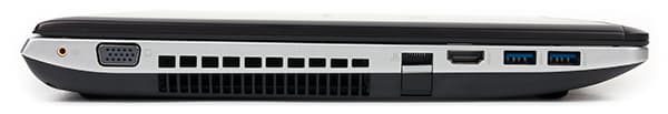 На левом торце корпуса расположены два порта USB 3.0, разъемы HDMI и VGA, разъем RJ-45 и разъем для подключения сабвуфера. Разъем RJ-45 имеет откидывающуюся крышку, что позволило сделать ноутбук достаточно тонким.