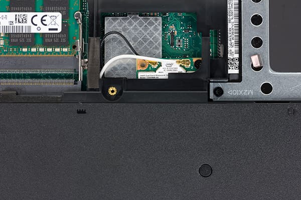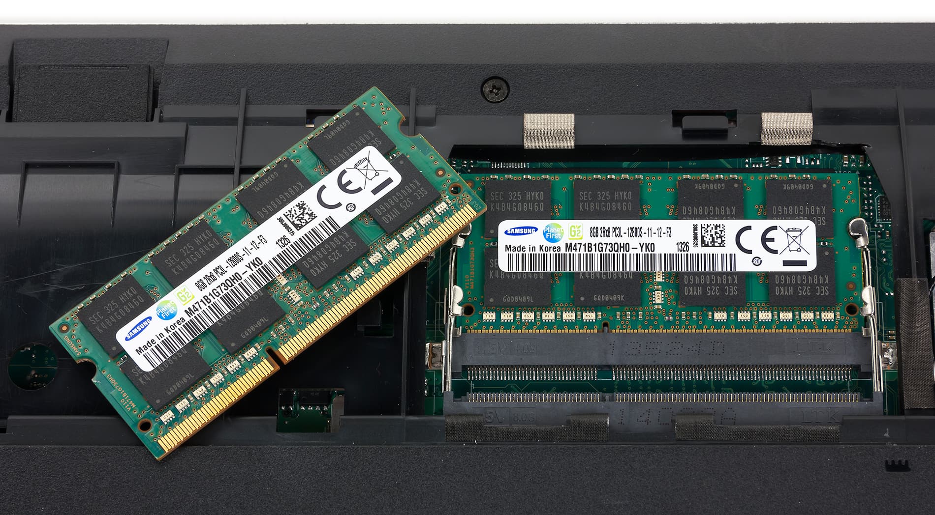 Для установки модулей памяти SO-DIMM предусмотрены два слота. В нашем случае в ноутбуке были установлены два модуля памяти DDR3-1600 Samsung M471B1G73QH0-YK0 емкостью по 8 ГБ каждый. Таким образом, суммарный объем оперативной памяти составлял 16 ГБ.