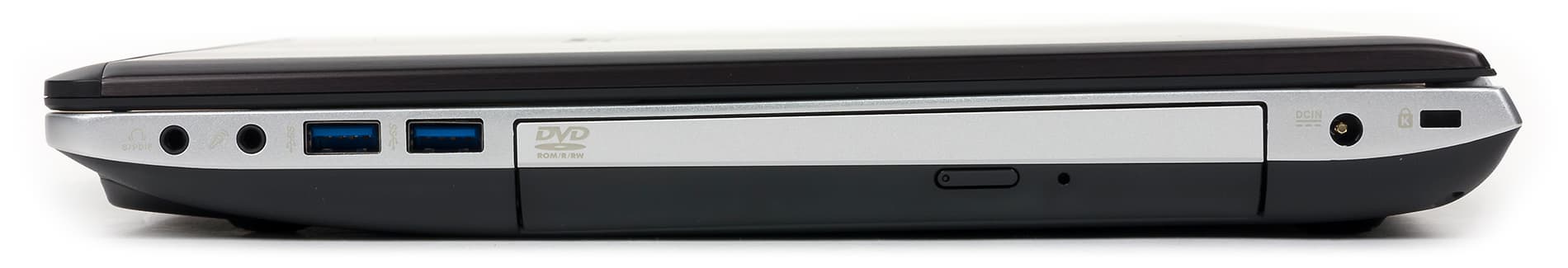 На правом торце корпуса расположены еще два разъема USB 3.0, два аудиоразъема, разъем для подключения адаптера питания, лоток оптического привода и отверстие кенсингтонского замка.