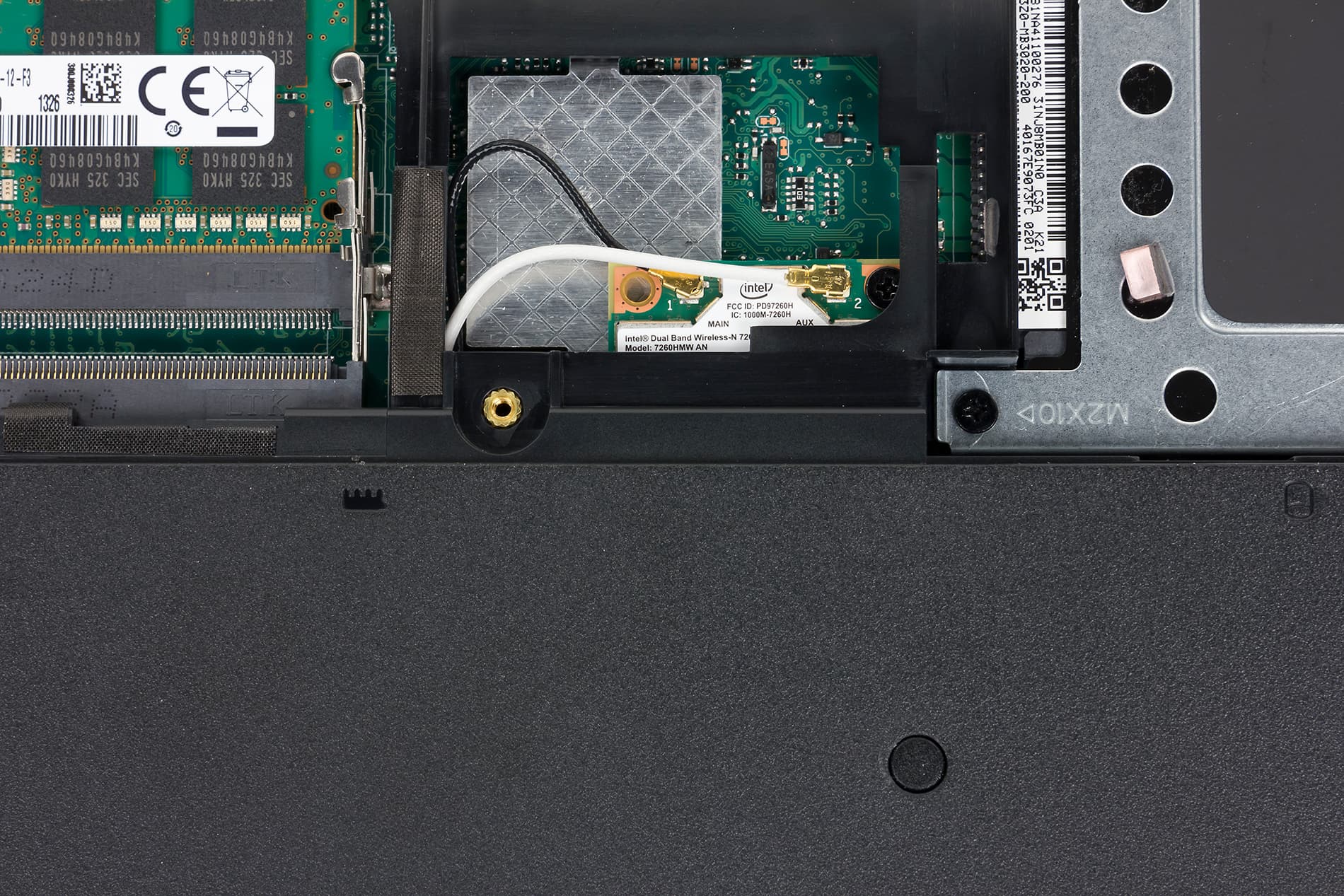Нижняя панель корпуса съемная, причем в ней имеется еще и отдельная съемная панель, сняв которую, можно получить доступ к модулю беспроводной связи, накопителю и модулям памяти. Сразу отметим, что конструкция этой съемной панели очень непродуманная, и снять ее, не повредив внутренних защелок, довольно непросто. Так что без острой необходимости лучше не экспериментировать.