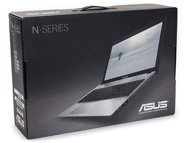 Ноутбук Asus Asus N56JR поставляется в довольно компактной по размерам коробке с ручкой, которая оформлена в традиционном для ноутбуков Asus N-серии стиле.
