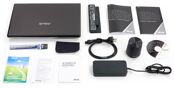 Кроме самого ноутбука, который запакован в матерчатый конверт, в комплект поставки входит зарядное устройство мощностью 120 Вт (19 В, 6,32 А) и традиционный для мультимедийных ноутбуков Asus внешний сабвуфер.