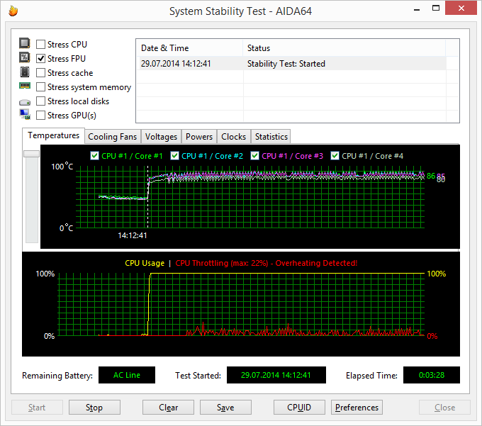 При загрузке процессора тестом Stress CPU (утилитой AIDA64 Extreme Edition — тест на стабильность системы), который использует целочисленные вычисления, частота процессора составляет 3,2 ГГц (напомним, что для процессора Intel Core i7-4700HQ максимальная частота в режиме Intel Turbo Boost составляет 3,4 ГГц). Температура процессора в этом режиме загрузки увеличивается до 81 °С.