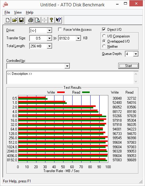 Утилита ATTO Disk Benchmark определяет максимальную скорость последовательного чтения и записи на уровне 100 МБ/с. Результат, конечно, очень скромный по сегодняшним меркам, особенно если ориентироваться на SSD-накопители