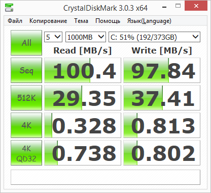 Утилита CrystalDiskMark также определяет скорость последовательного чтения и записи на уровне 100 МБ/с.