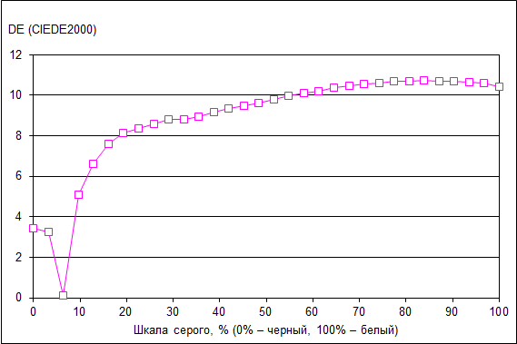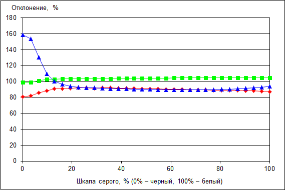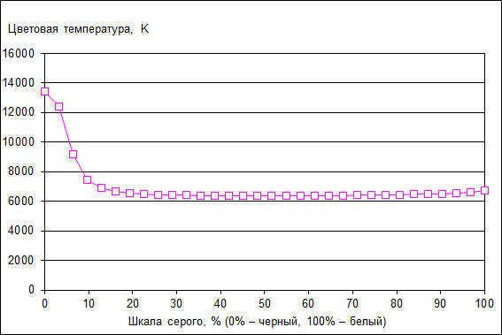 Стабильное значение цветовой температуры объясняется тем, что основные цвета хорошо сбалансированы по всей шкале серого.